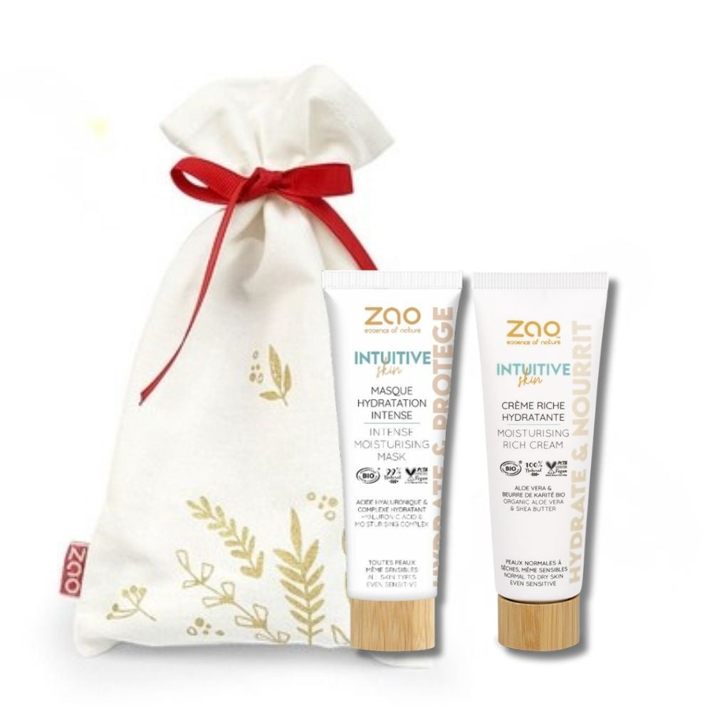 Incluye nuestra bolsita navideña en algodón orgánico, la Mascarilla Hidratante Intensa, enriquecida con Acido Hialurónico Vegetal, y la Crema Rica Hidratante.